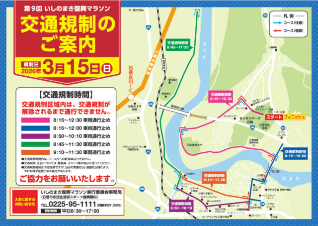 いしのまき復興マラソン当日は、マラソン大会とブルーインパルス展示飛行が同時に行われるため、市内の一部エリアで交通規制が実施されます。