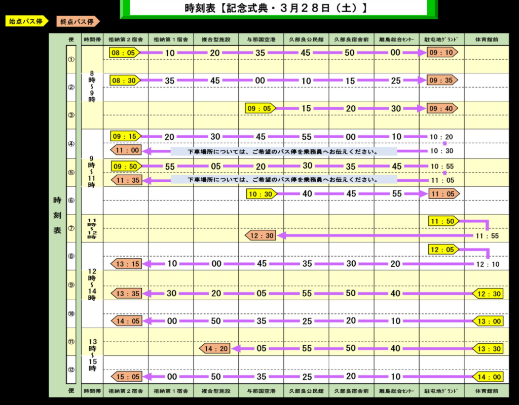 与那国駐屯地10周年記念行事では、島内各地から会場へ向かうシャトルバスの運行が案内されています。