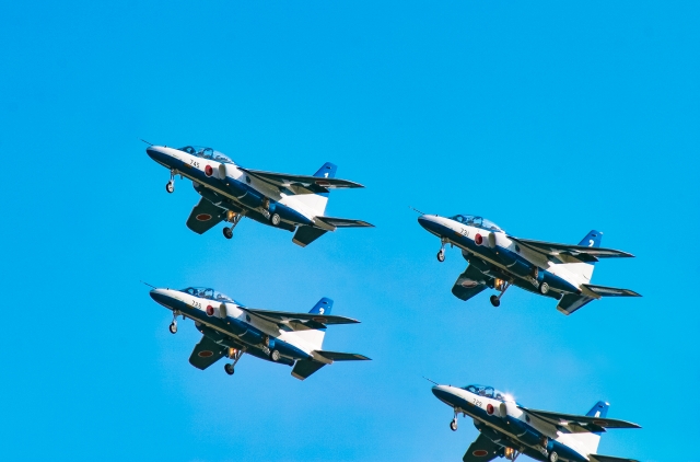 ブルーインパルスが使用するT-4は、国産の中等ジェット練習機で、鮮やかな青と白の塗装が特徴的です。